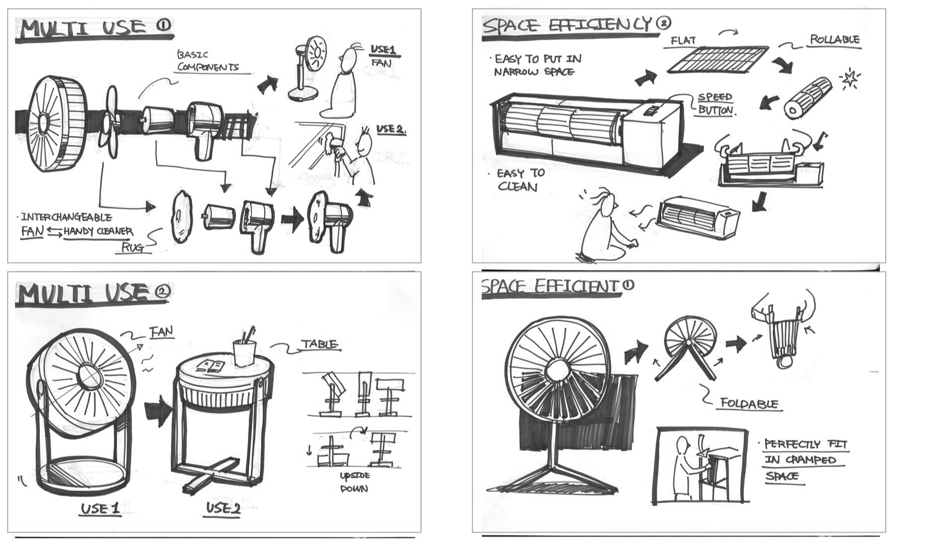 I started research with understanding the value of minimalism by conducting a survey and interviews. To observe their lifestyle closely, I watched the documentary film ‘Minimalism’, Matt D'Avella. Then I brainstormed values that I could create by designing a new fan and studied other multi-functional products to get insights.
